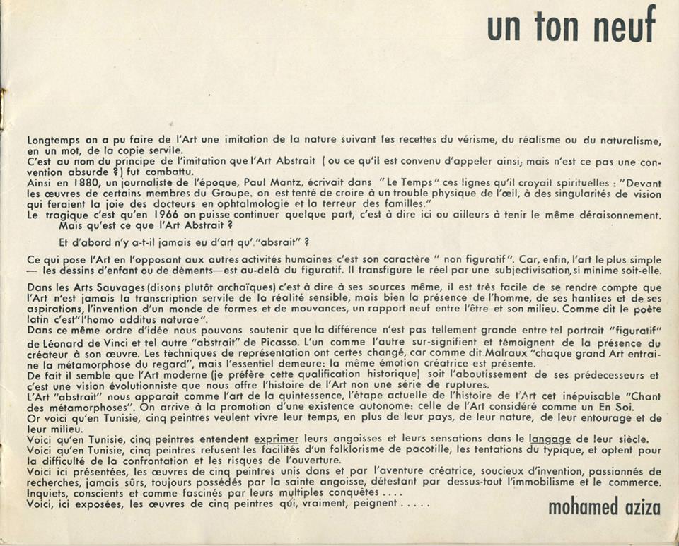 Voici qu'en Tunisie, cinq peintres refusent les facilités d'un folklorisme de pacotille, les tentations du typique, et optent pour la difficulté de la confrontation et les risques de l'ouverture.